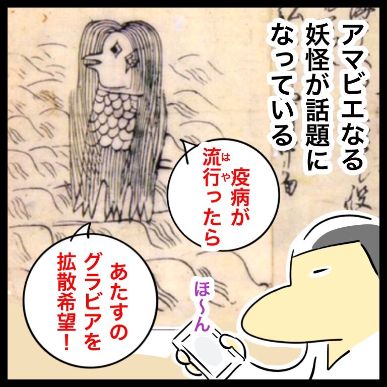 ●発言:「あたすアマビエ!もし疫病が流行ったら、あたすのイラストをみんなに見せて!(ただし収まるとは言ってない)」
