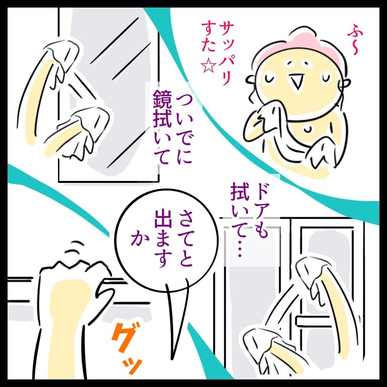 しかもよく見りゃ浴室側のドアにもあった…てことはあたす氏がドアの水滴を拭いた際にうっかりスライドさせた可能性…ギャスーー!!