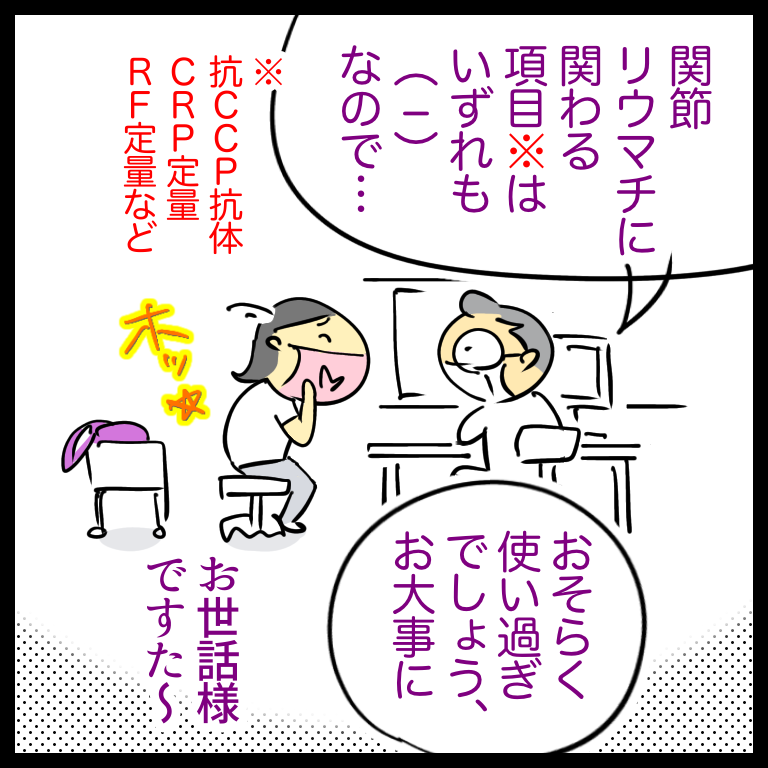 【手指のこわばり5】血液検査の結果にドキドキ 2022年07月11日 19:33 指のこわばりの記事① ② ③ ④ の続きです「いったんCMでーす」じゃなくて、ありがち〜!ホッとした瞬間すべてが吹っ飛んだわとはいえ不安要素が払拭されて良かった良かった、とりあえず様子見して騙し騙しやっていこうと思います※ 続きはコチラ↓ ◯☆゚・:,。*:..。o○☆*:゚・:,。*:..。o○☆゚・:,。*:..こんにちは、へそです。毎度おそがいチャンネルをご覧いただきありが とうございます。パワーがアップするので 拍手・コメント・読者登録 などリアクションいただけると嬉しいです。ではまた見てくださいね〜! 「手指のこわばり」カテゴリの最新記事 タグ :#ライブドアブログ#コミックエッセイ#絵日記#イラスト#更年期#整形外科#血液検査#手指のこわばり#関節痛 < 前の記事次の記事 > コメント コメントフォーム 名前 コメント 記事の評価 リセット リセット 顔 星 情報を記憶 コメントを投稿する