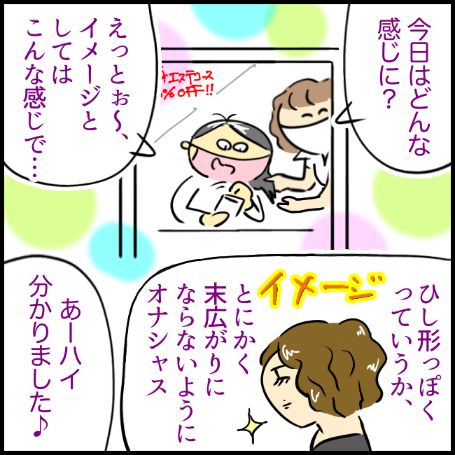 【ヘアスタイル難民】美容院、なぜか希望の髪型にならない 2022年10月20日 19:33 末広がっとるやないか〜い(心の声)ダメ押ししてくるまぁいっか、おめでたい感じできっとすぐ収まる(てか慣れる)だろう…多分ね◯☆゚・:,。*:..。o○☆*:゚・:,。*:..。o○☆゚・:,。*:..こんにちは、へそです。毎度おそがいチャンネルをご覧いただきありがとうございます。パワーがアップするので 拍手・コメント・読者登録 などリアクションいただけると嬉しいです。ではまた見てくださいね〜! 「その他」カテゴリの最新記事 タグ :#ライブドアブログ#コミックエッセイ#絵日記#イラスト#美容院#末広がり#ヘアスタイル難民 < 前の記事次の記事 > コメント コメント一覧 (6) 1. mie 2022年10月23日 23:28 なかなかね。思い通りのヘアスタイルになった事ない(T . T) あーやったり、こーやったりして、その内自分になじんでくるというか、見慣れてくる?(笑) 0 へそ がしました 4. へそ(ブログ管理人) 2022年10月24日 07:51 >>1 mieさま mieさまもですか✨ そーおなんですよ、お陰様で10日経ってようやく馴染んできました😃 0 へそ がしました 2. まるる 2022年10月23日 23:39 わかるー! そんな難しい事言ってないけど。。と思う事多々。 ちょっとここがと言おうともんならクレームつけられたと勘違いして不機嫌になるし 何故こっちが気を使わないといけないのやら。。😩 最近の美容師指導 どうなってるのかしら? 0 へそ がしました 5. へそ(ブログ管理人) 2022年10月24日 07:52 >>2 まるる様 共感嬉しいです😃 機嫌が悪くなるとかやめて…たまの美容院、癒しておくれよ!ってなりますよねぇ。 0 へそ がしました 3. ひー 2022年10月24日 05:09 素人でも分かる!レイヤーを入れて、トップと裾のロットは変える…パーマの後にもカットする…美容師さん選びって、彼氏選びより大切だと思います! 0 へそ がしました 6. へそ(ブログ管理人) 2022年10月24日 07:56 >>3 ひー様 彼氏選びより大切…うまいっ!確かに合う美容師さん探しの旅に出っ放しの人(ホッ◯ペッパービューティーのクーポン握りしめ)、結構いますよね。 0 へそ がしました コメントフォーム 名前 コメント 記事の評価 リセット リセット 顔 星 情報を記憶 コメントを投稿する
