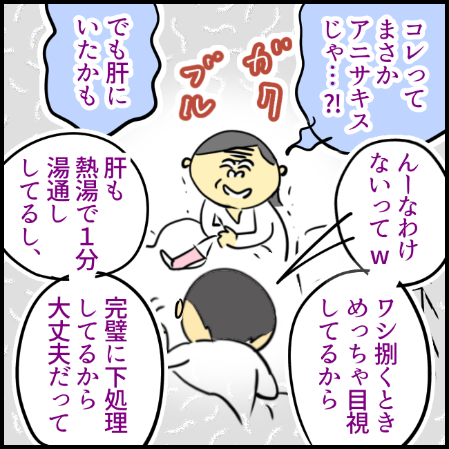 【アニサキス!?】釣った魚を食べたら夜中に胃がキリキリした 2022年10月21日 19:33 ※アニサキスは熱処理の場合「70度以上の加熱」もしくは「60度以上で1分間以上の加熱」で死滅するそうふぅー、命拾いしたわこないだもスーパーの惣菜コーナーでブリの煮付けを買ったら立派なアニサキスが付いてたし(煮付けられて無害)、気になるよね〜カワハギが肝パンになる季節、みんなも気をつけて召し上がってね◯☆゚・:,。*:..。o○☆*:゚・:,。*:..。o○☆゚・:,。*:..こんにちは、へそです。毎度おそがいチャンネルをご覧いただきありがとうございます。パワーがアップするので 拍手・コメント・読者登録 などリアクションいただけると嬉しいです。ではまた見てくださいね〜! 「釣り・お酒」カテゴリの最新記事 タグ :#ライブドアブログ#コミックエッセイ#絵日記#イラスト#釣り#カワハギ#肝パン#アニサキス#正露丸 < 前の記事次の記事 > コメント コメントフォーム 名前 コメント 記事の評価 リセット リセット 顔 星 情報を記憶 コメントを投稿する