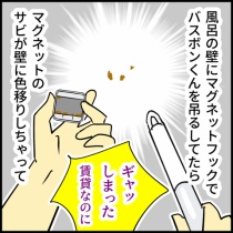 BGM:負けないで水回り用のマグネットフックを使用すべきだったと猛省…「ユニットバスの壁に磁力があると聞いて、手持ちのマグネットフック貼りまくって超便利♪」って奥さま、お気を付けあそばせね◯☆゚・:,。*:..。◯☆゚・:,。*:..。o○☆*:゚・:,。*:..。TRILLマンガ様にブログ記事 ...